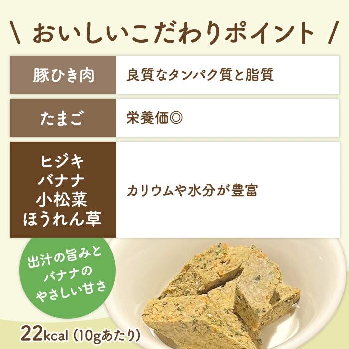 原材料:豚赤身ひき肉、サツマイモ、青梗菜、小松菜、ほうれん草、かぼちゃ、にんじん、しいたけ、りんご、バナナ、ひじき、鶏卵、米粉、すりごま、コーングリッツ、きな粉、煮干し粉