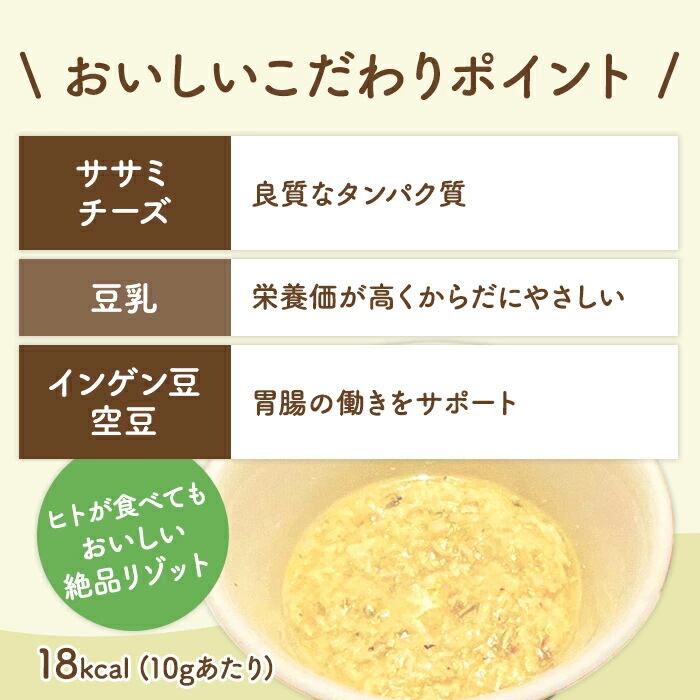 原材料:鶏ササミ、空豆、さやいんげん、にんじん、ブロッコリー、豆腐、豆乳、うるち米(白米)、パルメザンチーズ(粉)